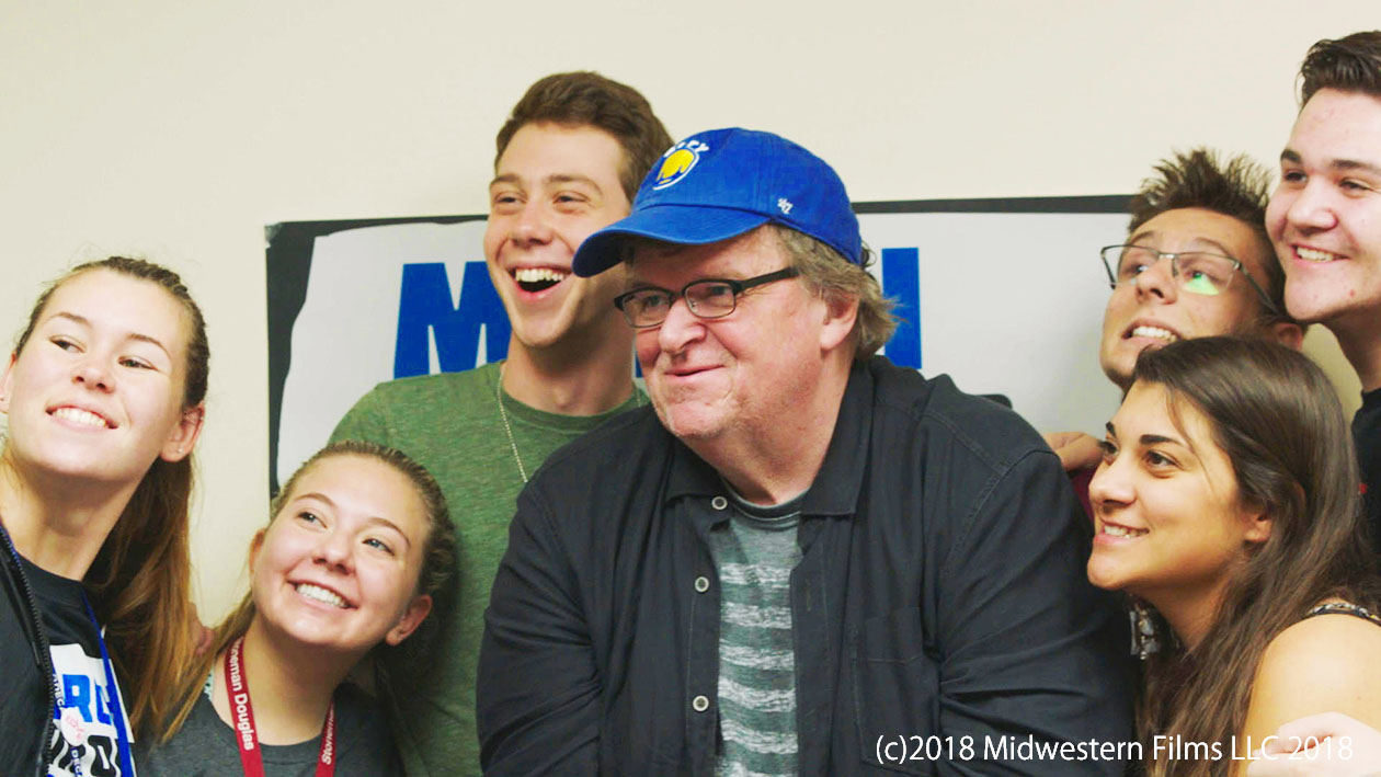銃規制の運動を起こした高校生たちと交流するマイケル・ムーア監督(映画の一場面)