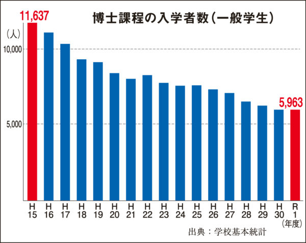 博士課程に進学する学生の数は、ピーク時の平成15年度に1万1600人いたのが減り続け、昨年度は6000人を割っている。独立行政法人化以後に半減したということだ。博士課程を終えても大学や研究機関で働ける保証などないのだから、当たり前だ。大学4年間だけでも経済的負担は大きいのに、博士課程まで終える9年間に必要な学費・生活費は平均値で1779万円にのぼると日本学生支援機構の調べでも明らかになっている。