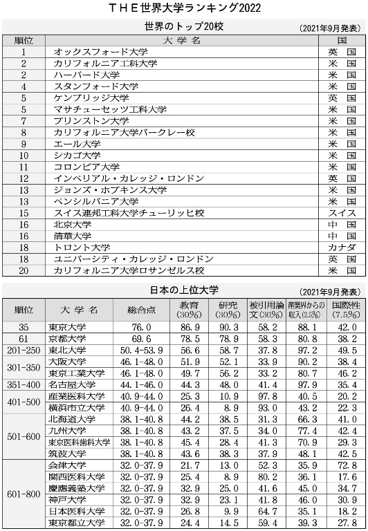 A イギリスの教育情報誌である『タイムズ・ハイヤー・エデュケーション(通称THE)』が毎年発表する、世界の大学の教育研究活動に関するさまざまな項目を評価する「世界大学ランキング」というものがある。最新の2022年版では、世界99カ国にある1600以上の大学を対象として、論文引用数や教育・学習環境、研究、国際性などを評価してランキングが発表されている。いわゆる偏差値を比べたものではなく、大学の教育研究機関としての一定の指標として注目されているものだ。
