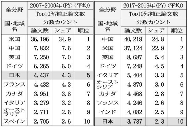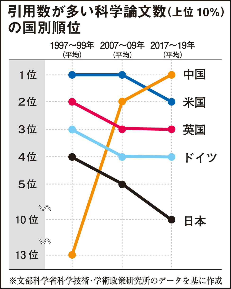 B 教育研究機関として生命線なのが研究力で、それは必然的に学術論文の質や量に反映する。どれだけ他の論文に引用されたかは、その研究の注目度や信頼度、影響力の大きさを映し出すものでもあるが、例えば文部科学省の科学技術・学術政策研究所が発表したところでは、2017~2019年に自然科学分野の学術論文のうち、他の論文に引用された回数が上位10%に入る影響力の大きな論文の数で、日本は過去最低の世界10位に後退した。中国が米国を抜いて世界1位に上り詰めたのとは対照的なものだった。