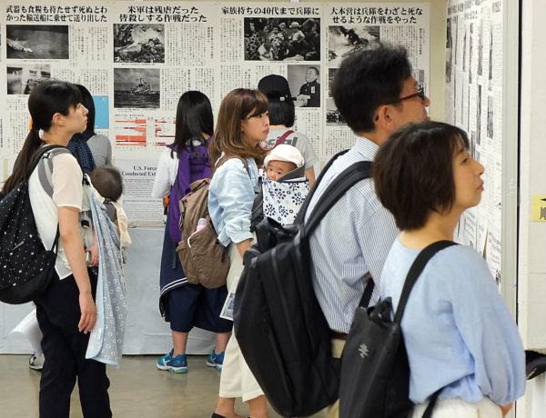 また、県外や海外からの参観者も多く、「経済不況から戦争に突入していった事実は、今と重なり説得力がある。日本は米国に占領され、今もその支配が続いている。日本の政治が劣化しているのはそのためだ。安倍首相の発言もすべてトランプの演説の猿まねで自分の頭では考えていない」(東京都・退職大学教員)、「情報がとても明確で理解しやすいものだった。とりわけ第2次世界大戦のはじめの段階がとても興味深い。これまで戦勝国側の論理しか聞いてこなかったので、戦争終結のためではなく、戦後の覇権のために原爆を投下したという内容は衝撃だった。世界がふたたび戦争に向かうことを危惧している。再びこの悲劇が起こるのを防ぐためにも過去に学ぶ必要がある」(イギリス人女性)とのべ、英訳冊子を求めた。