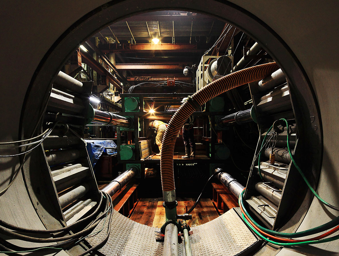 推進工法による共同溝トンネルの建設。輪切りの推進管をジャッキで圧入しているところを最後尾から撮影