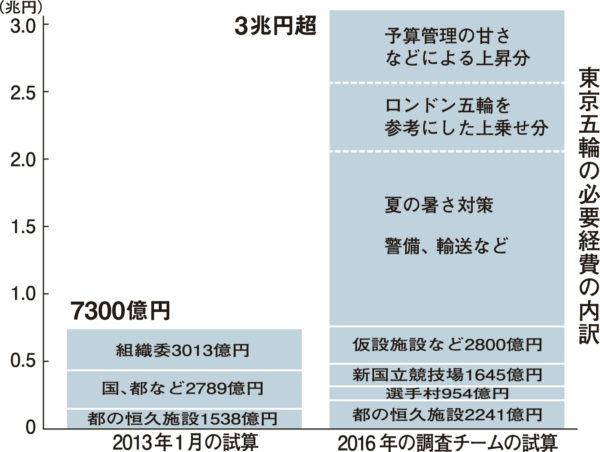 こうして、2013年1月の五輪立候補時には約7300億円といっていた東京五輪の総経費が、ついに3兆円をこえる見込みになったと、東京都の調査チームが発表している。前回、前前回の五輪と比べても2倍をはるかに上回る桁外れの額である。しかも現状では、東京五輪組織委員会がスポンサー協賛金やチケット販売などによって見込んでいる収入は6000億円だけなので、莫大なツケが国民に回される可能性が高い。