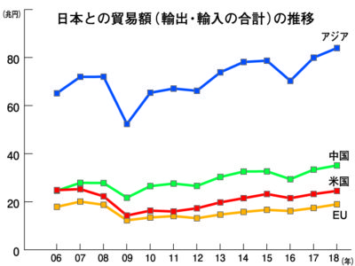 中国やアジア圏の対日貿易額は、リーマン・ショック前の水準にようやく回復したアメリカやEUを遙かに上回る伸びを見せている【グラフ参照】。それは今後、アジア経済圏の市場が拡大していく変化を示唆している。とくに大きな変化は朝鮮戦争終結に向けて和平交渉が進む朝鮮半島である。ゴールドマン・サックスは南北統一後の朝鮮半島のGDPについて、フランス、ドイツ、日本を抜く規模だと試算している。鉱山資源はタングステン、モリブデン、重晶石、黒鉛、銅、マグネサイト、雲母、蛍石などが世界の上位10位圏内に入るなど豊富で、その埋蔵量は300兆円規模と見られている。