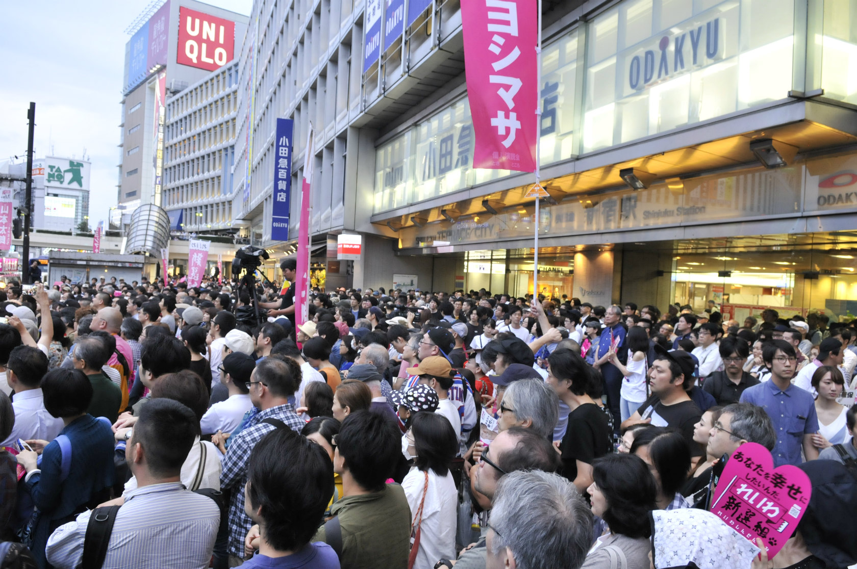 JR新宿駅西口での街頭演説には若い人たちが多く足を止めた(15日)