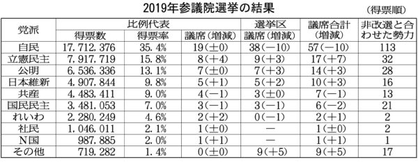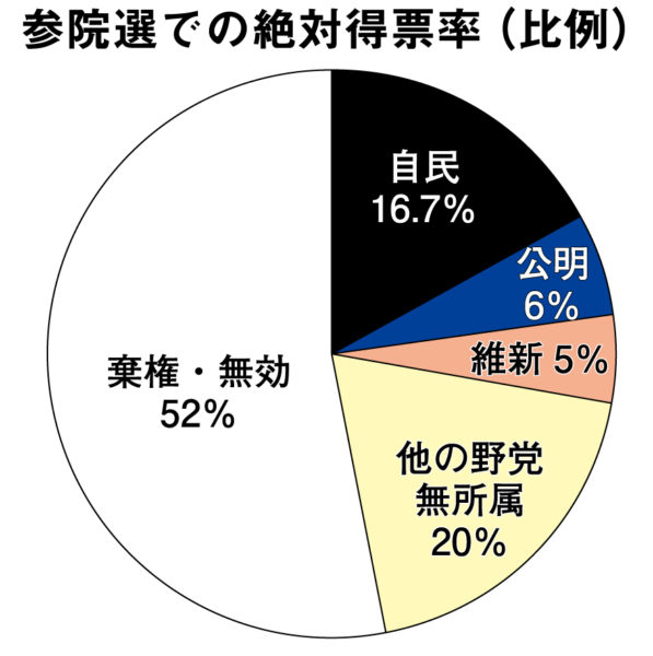 A まず結果をどう評価するかだが、大手メディアを見ていると「自公改選過半数」「与党勝利 改選過半数」「首相 改憲議論を加速 “審判下った”」等等、まるで自民党が勝ったかのようなとりあげ方に終始している。自民党としては改選議席67から当選者は57と10議席減らしている。参議院の245議席のうち113議席へと減り、単独過半数割れに逆戻りした。比例票は前回16年の参院選から240万票減。全有権者に占める絶対得票率は16・7%。第二次安倍政権発足後の最低だ。これらは明らかに自民敗北といえる数字だ。さらに公明党の瓦解状況も顕著で、比例票は16年の前回参院選では757万票あったのが653万票と100万票も減っている。それで自公に維新を足しても改憲勢力として必要な3分の2(164議席)にも達しなかったのに、なにが「改憲議論を加速」かだ。安倍晋三の精神勝利法(阿Q正伝)的思考に引きずりこまれているかのようだ。