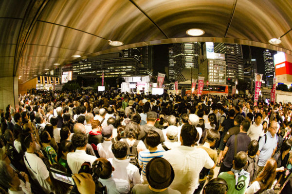 街頭記者会見に駆けつけた聴衆に埋め尽くされた新宿駅西口(1日)
