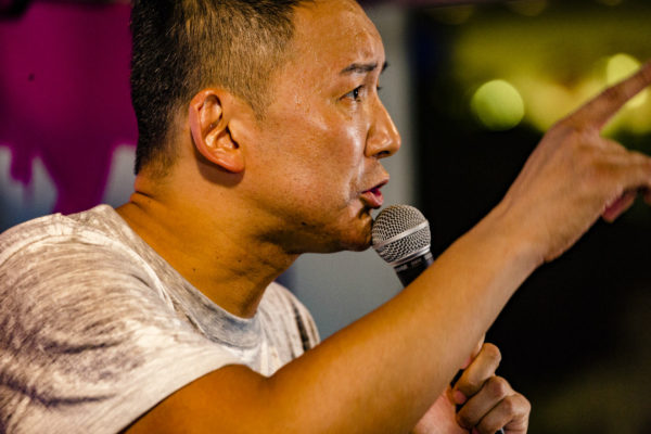 【ここからは参加者からの質問を受ける形で街頭記者会見は進んだ。メディアに対しても会見後の囲み取材は受け付けないことを告げ、一般参加者と区別なく質問を受け付けた。今後、全国での街頭演説もこの形で進めていくことを告知した】