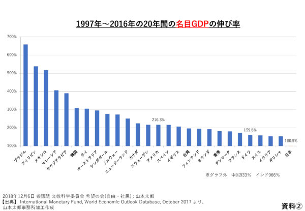 同じくIMFの名目GDPの伸び率、どれだけ成長したかをみると、日本はグラフにも載らない。この国で20年以上デフレが続き、消費も投資も弱り、需要を奪われ続けた理由は、適切な投資がされてこなかったことにあるのは明らかだ。間違った経済政策によってみんなが貧しくなったということだ。このことについて謝った政治家はいるのか。