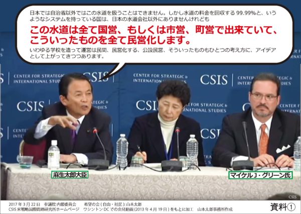 そして麻生大臣は、国民に説明する前にわざわざ米国の一民間シンクタンクまで出向き、日本の水道について「この水道はすべて国営、もしくは市営、町営でできていて、こういったものをすべて民営化します」と公言した。ちょっと待ってほしい。日本中の水道は麻生さんがつくったのだろうか? みなさんの税金でつくられたものだ。勘違いも甚だしい。