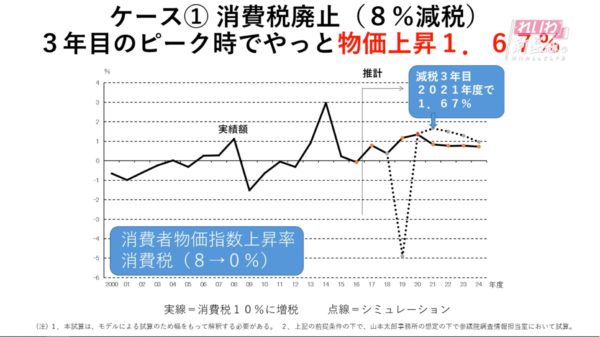 最後に、新規国債の発行で消費税をすべて廃止した場合なにが起きるかを話す。参議院調査情報担当室に消費税を8%から0%にした場合のシミュレーションをしてもらった。初年度には5%物価が下がる。その後、徐徐にまた上がって3年目にインフレ率のピークを迎えるが1・67%だ。2%にも満たない。それどころかインフレ率はまた落ちていく。つまり、消費税廃止だけではなく、奨学金の総貸与高9兆円を解消することもできる。そのほかにもやれることはたくさんある。今救わなくていつ救うのか。また、消費税を廃止にした場合、みんなの賃金がどれほど上がるのか。消費税廃止後6年目には一人あたりの年間賃金が44万円増加する。なぜならとられる罰金がなくなって、消費が増えれば誰かの賃金に変わるからだ。