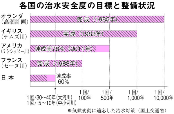 治水対策を見ると、洪水に対する川の安全度を示す治水安全度の国際比較では、オランダが1万年に1回発生する洪水(高潮被害)に対する治水事業をすでに完成させ、イギリス(テムズ川)が1000年に1回発生する洪水に対する治水事業を完成させているのに対し、日本では、河川によって違いがあるが、たとえば荒川では200年に1回発生する洪水に対する治水事業の達成率が67%と、大幅に遅れている【表参照】。
