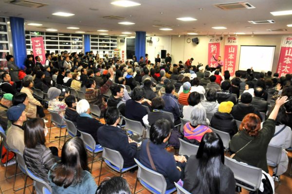 今後のたたかい方についても質問の声が上がった。山本代表は、「220万票を超える多くの票をいただいたが、政権交代を目指して獲得したのは2議席。これが現実であり、これを広げていくしか方法はない。横に広げていくのは一人一人だ」とのべ、来年2月ごろの衆院解散を見通しながら、「消費税5%」を共通政策とした野党共闘を目指し、それが無理なら単独で選挙戦をたたかうことを強調した。
