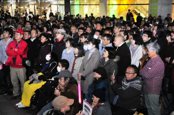 対話の声は路上にも響き、ガラス張りの会場の外にも通行人が足を止めてガラス越しに集会を見守った。「自民党議員でも動員がなければこれほどの人は集まらない。こんな熱気のある集会はめずらしい」と関心を注いでいた。