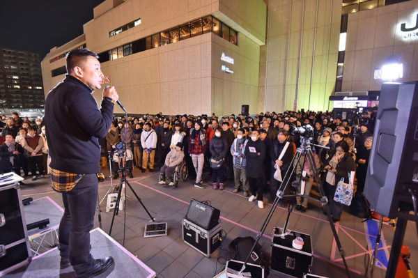 れいわ新選組の山本太郎代表は7日から関東ツアーを開始した。7日には神奈川県横須賀市でおしゃべり会を開き、9日には千葉県船橋市のJR船橋駅南口前で街頭記者会見をおこなった。駅前の広場に収まりきらないほどの聴衆が集まり、人工地盤の上から聞き入る人人も多かった。聴衆からの発言は現役世代が目立ち、自身の生活や労働環境への問題意識が語られた。会場では、同じ境遇にある聴衆が堰を切ったように自身の労働実態や過去の経験を語る一幕もあった。山本代表は現在の社会が、これまでの政治や一握りの経済界によってつくられてきた実態を明らかにするとともに「こんな世の中をつくり上げたのが政治なら、政治の力で新しい世の中をつくっていこう」と呼びかけ、れいわ新選組を中心に、一人一人が社会を変えるために広く繋がっていくことの重要性を訴えた。