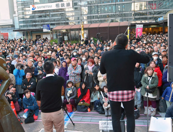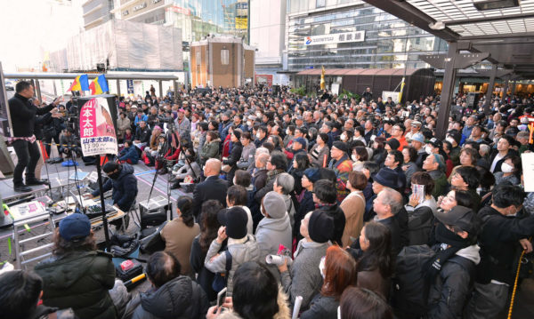 関東ツアーを展開しているれいわ新選組の山本太郎代表は14日、神奈川県横浜市の横浜駅西口・高島屋前で街頭記者会見をおこなった。演説に参加する人たちの数は日を追うごとに増し続け、横浜駅前でも広場を埋めた多くの老若男女が山本代表へ次次に質問を投げかけた。参院選後の全国ツアーの動向をネットなどで把握している人たちも多く、街宣会場には各地で勝手連的に活動しているボランティアたちも駆けつけ、参加者とお互いの経験や思いを共有しながら、新しい政治勢力を横に広げていく意気込みを高める場にもなっている。
