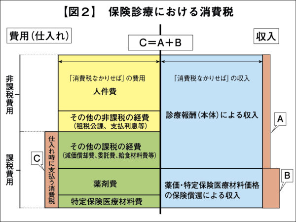 薬以外にも医療機関の仕入れ費用を見てみる【図2】と、人件費は非課税だが、特定医療保険材料(人工関節、ペースメーカーなど)、注射器や注射針、医療廃棄物処理費用、検査委託料、電子カルテや画像システムの保守管理料、さらに医療機器、電子カルテなどの購入、設備投資にも消費税がかかり、医療機関が負担することになる(C)。
