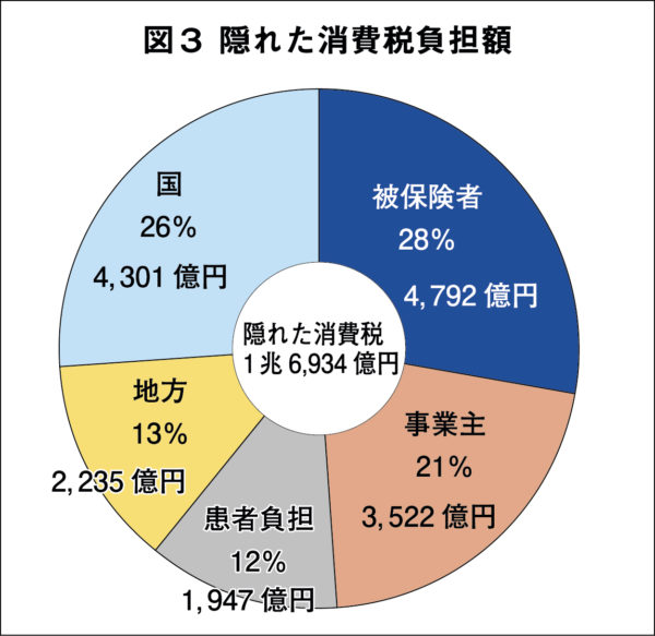 すると、「隠れた消費税」1兆6934億円は、被保険者が4792億円(28%)、事業主が3522億円(21%)、患者負担が1947億円(12%)、地方が2235億円(13%)、国庫が4301億円(26%)、つまり国以外で1兆2633億円も負担している【図3】。国の負担も、医療から没収した消費税(C)から負担しているに過ぎない。