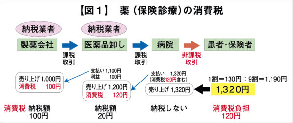 病院でもらう薬の消費税を見ると【図1】、製薬会社と医薬品卸は、納税業者なので消費税をプラスして売り、その分の消費税を納税する。病院も医薬品卸から購入するときには、薬代金のほかに消費税を医薬品卸に支払う。しかし、保険診療は「非課税取引」なので、その薬を使って治療をしたときに、患者からも保険者からも消費税分を受けとることはできない。