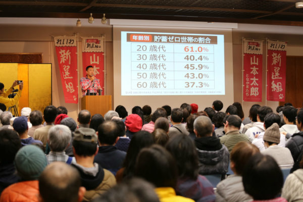 山本代表は疲弊する日本経済の課題について「IMF(国際通貨基金)のデータによると、1997年から2018年までの22年間の政府総支出の伸び率が、世界各国140カ国以上のなかで最下位だ。また、同じ22年間で名目GDPの伸び率も最下位になっている。投資をしない者がリターンを得られるわけがない。世界でナンバーワンのドケチ国家は、世界でワーストの貧乏国家になっている。これでもまだあなたの生活が苦しいのは、あなたのせいなのだろうか。世の中が貧しくなっていくと、心の余裕がなくなり人が価値で測られる社会になる。自分の価値を証明しなければ生きていていいと思えず、他人を蹴落としてまで価値を示さなければならない。それが極まると、自分に価値があるように見せるために、個人が他人の価値を決め命まで奪うという相模原事件のようなことが起こる。2万人近い人が自殺をし、50万人以上が自殺未遂をするような社会はすでに壊れている。非正規雇用でいつ首を切られるかも分からない状態で半年後、一年後の自分の人生が描けないなかで生きている人が多くいる。絶望のなかで生きている人たちの生活が底上げされる社会でなければ、政治が存在する理由も税金を払う理由もない。“自己責任”とは決して政治が口に出してはいけない言葉だ。少なくとも最低限安定した状況を保障できる経済的な基盤を作らなければならない。世の中にお金が回らず、20年以上デフレが続いている。どの国も緩やかなインフレを続けているのに、日本はみんな貧乏になり続けている。どん底への競争のなかで、消費が弱り続けているのに企業側が投資をするわけがない。これを変えるには人々の生活の底上げありきで、国による大胆な投資をおこなわなければならない。日本の経済成長ありきではなく、人々の生活がよくなってこそ経済が成長する」と訴えた。