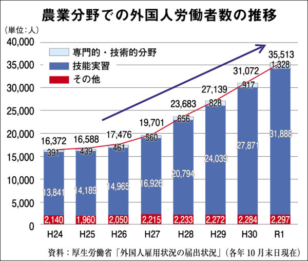 これまでの農業における外国人労働者の推移【グラフ参照】を見ると、毎年およそ4000人前後が入ってきている。それが新型コロナで入国できなくなり、春に来る予定だった2200人が入れなくなった。