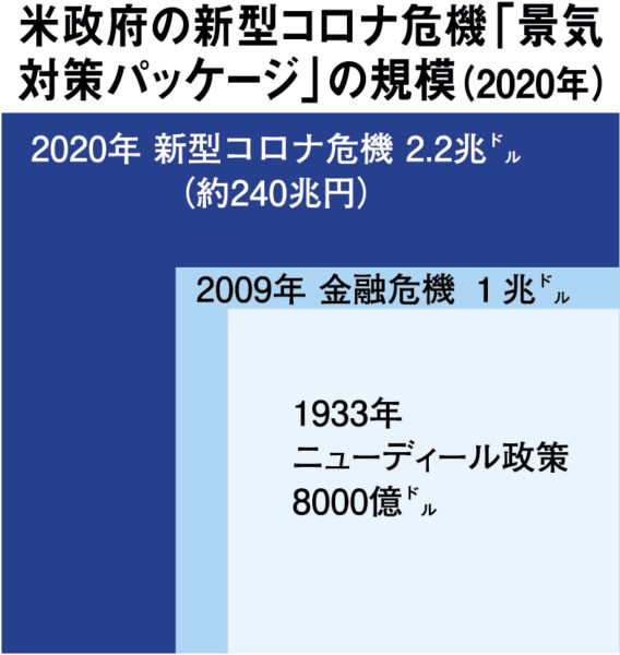 米国政府は、今回の新型コロナ危機に対する「景気対策パッケージ」として2・2兆㌦(約240兆円)の予算を付けた。これは米国史上最大の財政政策であり、1933年のニューディールでの8000億㌦(約86兆円)、2008年のリーマン・ショックに端を発した金融危機での1兆㌦(約107兆円)を優に凌ぐ規模だ。