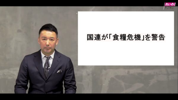 れいわ新選組の山本太郎代表は23日、国連が発した「食糧危機」の警告に関してYouTubeで動画を配信した。新型コロナ危機下で起きている各国の食料輸出規制、食料品価格の高騰などの動向とともに、食料自給率が4割に満たないにもかかわらず食料供給保護の対策があまりに貧弱な日本の現状を指摘し、大胆な財政措置を講じることを提言した。現在、感染症対策に必須のマスクですら生産の8割を中国に依存し、供給不足に陥るなかで、その大半を輸入に頼っている食料の不足は、より国民の生存を脅かす重大な問題として浮上している。以下、山本氏の配信内容を紹介する。