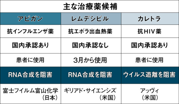 このうち日本で早くから注目を集めてきたのがアビガン、レムデシビル、カレトラ【主な治療薬候補の表参照】だった。なかでも一定量の備蓄と治療実績があるアビガンは国内外からすぐに投与を開始できる新型コロナ治療薬として、強い期待を集めた。