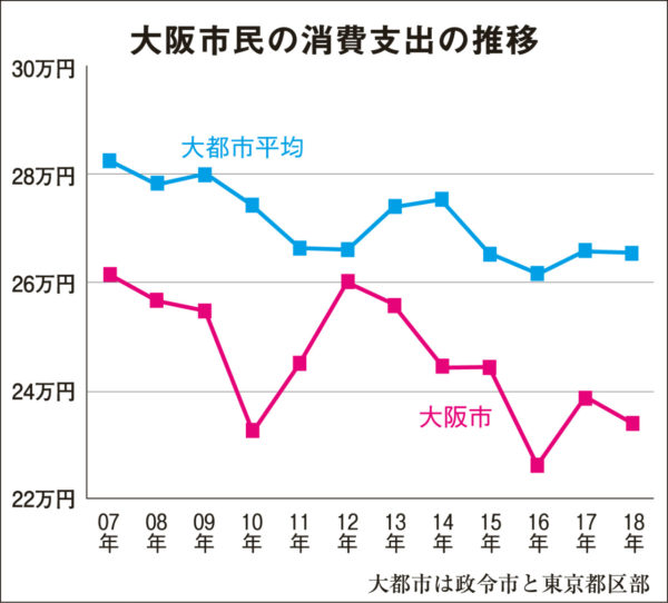 2006年に20兆4000億円だったGDPは、リーマン・ショック直後の2010年に18兆5000億円に下落した後、2017年は20兆円までしか回復しておらず、大阪府全体でもその回復幅は、東京、兵庫、愛知と比べても最下位だった。府民一人あたりの所得も同じく最下位で、大阪市民の消費支出も大都市平均を大きく下回っている【グラフ参照】。