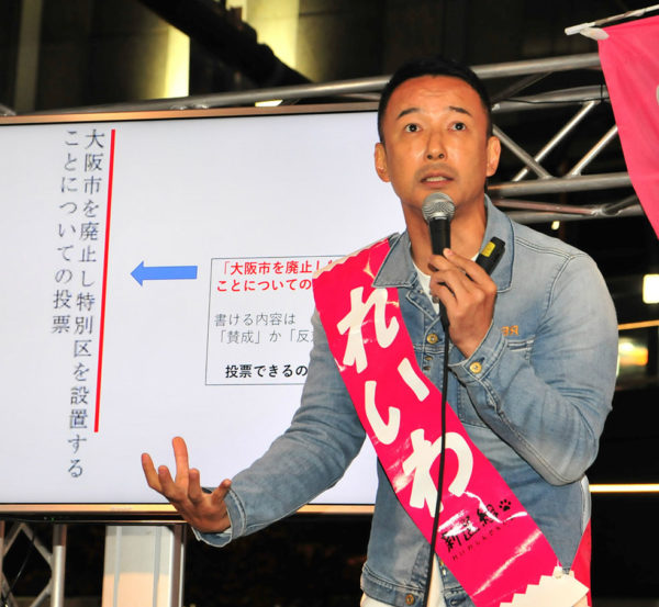 れいわ新選組の山本太郎代表は、大阪市で11月1日に投開票される「大阪市廃止・特別区設置」の住民投票に向け、大阪市内で「あかん!都構想」と称した街頭演説を、約2週間にわたって連日くり広げている。終盤戦はとくに市民が多く暮らす住宅地の地下鉄駅や区役所前、商店街などの生活空間でゲリラ街宣をおこない、「都構想」の内実を説明するとともに、大阪の行政をコントロールする大阪維新の会が垂れ流す数々の偽情報を検証し、市民の手で大阪市の廃止・解体にブレーキをかけることを呼びかけている。