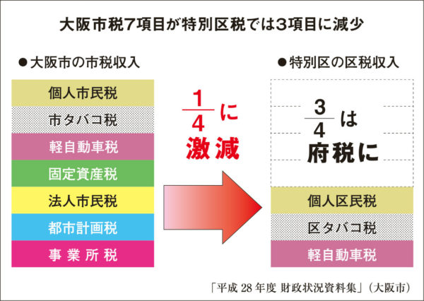 現在の大阪市が持つ自主財源8500億円のうち、市廃止後の4区に残る財源は2500億円。残りの6000億円は大阪府が吸い上げ、そこから4000億円を“おこづかい”として府から特別区に毎年配分する。さらに残りの2000億円は丸ごと府の財源になる。この使い方は大阪府が自由に決められる。税収でも4分の3が府に召し上げられる【表参照】。