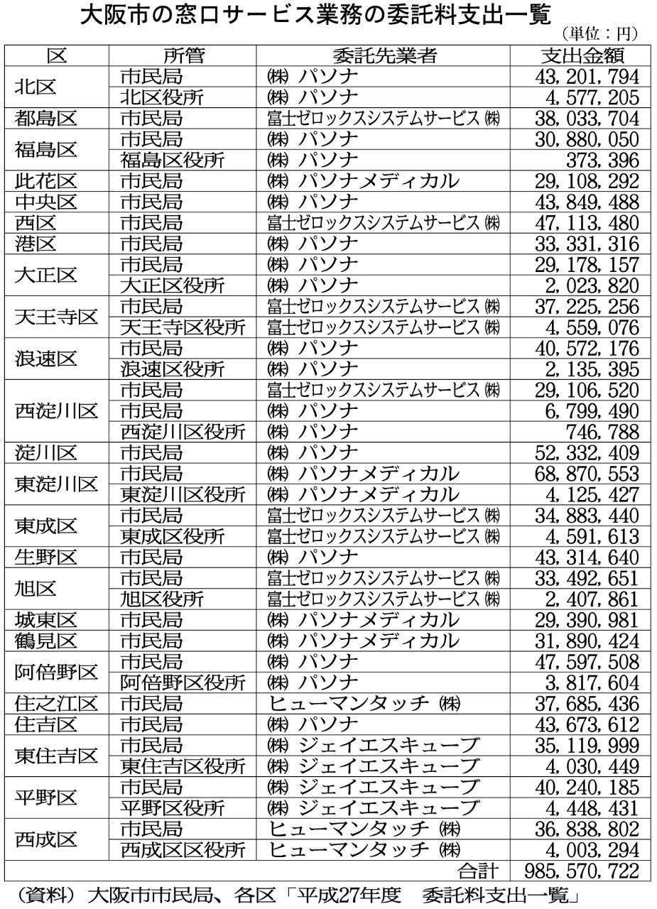 行政改革で外注化した大阪市各区役所の窓口業務の委託先【表参照】を見ても、公務員を削減した分、その既得権がパソナに移っただけの話だ。橋下をダボス会議に招き、米CSISにも繋いだ竹中自身が、「ムダの削減」「生産性の向上」といって行政改革の旗振り役になって公的機関を切り刻み、その果実をみずからが吸い上げていくという露骨なビジネスモデルをやりまくっている。その結果、行政サービスが低下しようと、利益相反といわれようとお構いなしなのだ。「米国では常識ですよ」といった調子だ。