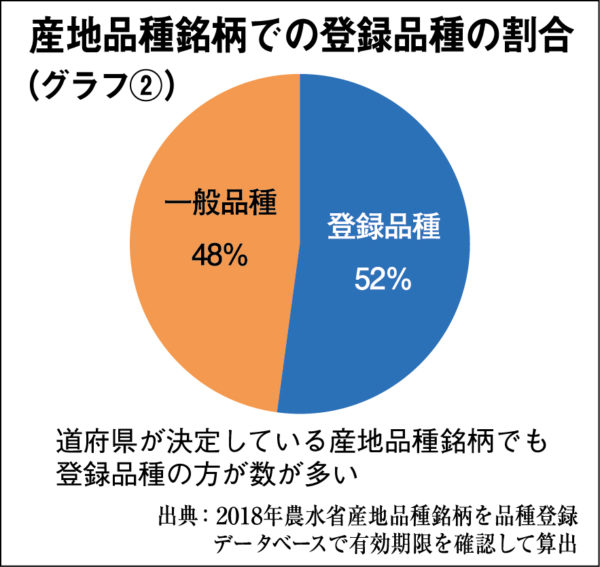 今回の法案でさらにおかしいのは、農家にどのような影響を与えるかについての説明の内容だ。農水省は「種苗法の対象となる登録品種は1割程度であり、それ以外の9割が自家増殖できる一般品種だ」と説明している。本当にそうなのか調べてみた。しかし、各都道府県が設定している産地品種銘柄に指定される銘柄を調べると半分以上が登録品種だ【グラフ②】。稲を見ると「コシヒカリ」は一般品種なので多くの農家が生産しているが、それでも稲に占める登録品種の割合は33%である。農水省がいう1割というようなものではない。各県が力を入れている、例えば沖縄のサトウキビも、登録品種の割合が非常に高いと考えられる。「登録品種は1割しかない」という説明と現実はかなり違いがある。