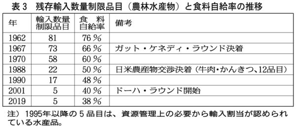 これは、自動車などの輸出のために農と食を差し出す貿易自由化が進められた結果でもある。【表③】のとおり、貿易自由化の進展と食料自給率の低下には明瞭な関係がある。農林漁業は貿易自由化も通じた一部企業の利益の犠牲とされ続けている。