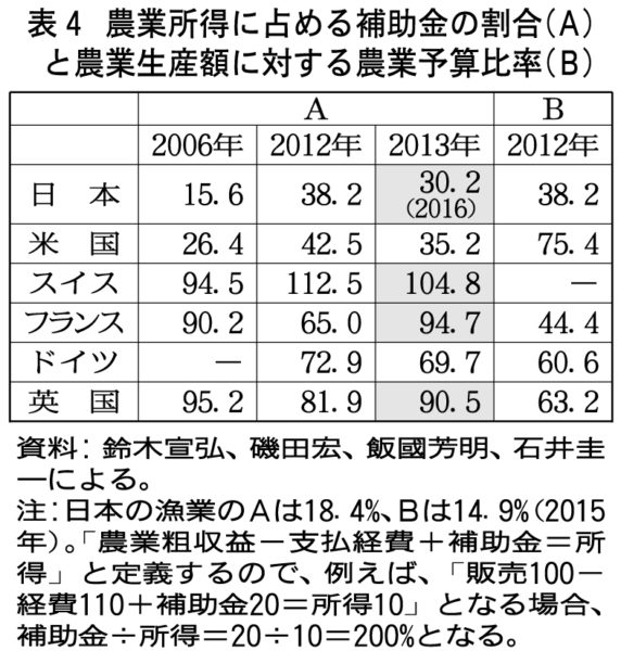 【表④】のとおり、欧州諸国では、農業所得の90~100%が政府からの直接支払いの国もある。日本は30%前後で、オセアニアを除く先進国では最低水準だ。米国・カナダ・EUは最低価格を支えるために穀物や乳製品を政府が買い入れる仕組みを維持している。支持価格による政府買い入れを廃止したのは日本だけだ。
