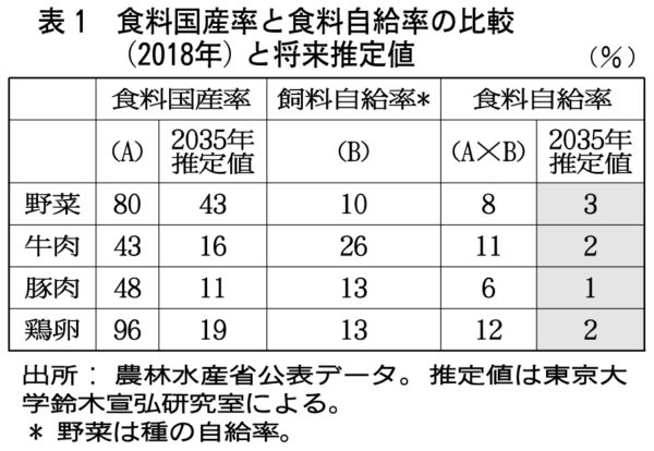 特に、【表①】のとおり、飼料の海外依存度を考慮すると、牛肉の自給率は現状でも11%、このままだと2035年には2%、種の海外依存度を考慮すると、野菜の自給率は8%、2035年には3%と、驚くべき低水準に陥る可能性がある。このままでは地域コミュニティが維持できるわけがないし、地域の住民や国民に安全安心な食料を量的に確保することも到底できない。
