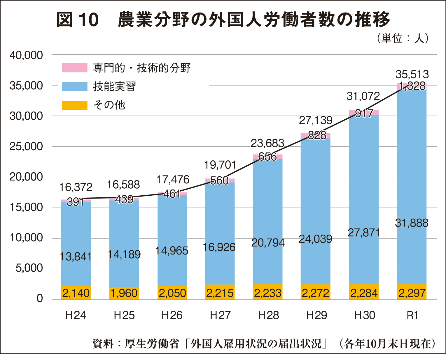 同様に、農業労働力の海外依存度を考慮した自給率も考える必要が出てくる(九州大学・磯田宏教授)。海外研修生の件は、その身分や待遇のあり方を含め、多くの課題を投げかけている。一時的な「出稼ぎ」的な受入れでなく、教育・医療・その他の社会福祉を含む待遇を充実させ、家族とともに長期に日本に滞在してもらえるような受入れ体制の検討も必要であろう【図⑩参照】。