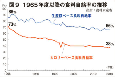 コロナ・ショックは、カロリーベースと生産額ベースの自給率の重要性の議論にも、「決着」をつけたように筆者には思われる。一部には、「カロリーベースの自給率を重視するのは間違いだ」(元農水省事務次官)と指摘する声もあるが、生産額ベースとカロリーベースも、それぞれのメッセージがある【図⑨参照】。