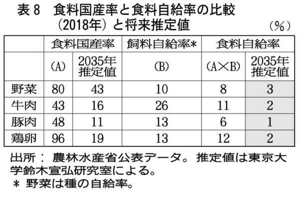 それにしても、【表8】の将来推定値は衝撃的である。このままだと2035年には、飼料の海外依存度を考慮すると牛肉、豚肉、鶏肉の自給率は2%、1%、2%、種の海外依存度を考慮すると野菜の自給率は3%と、信じがたい低水準に陥る可能性さえある。