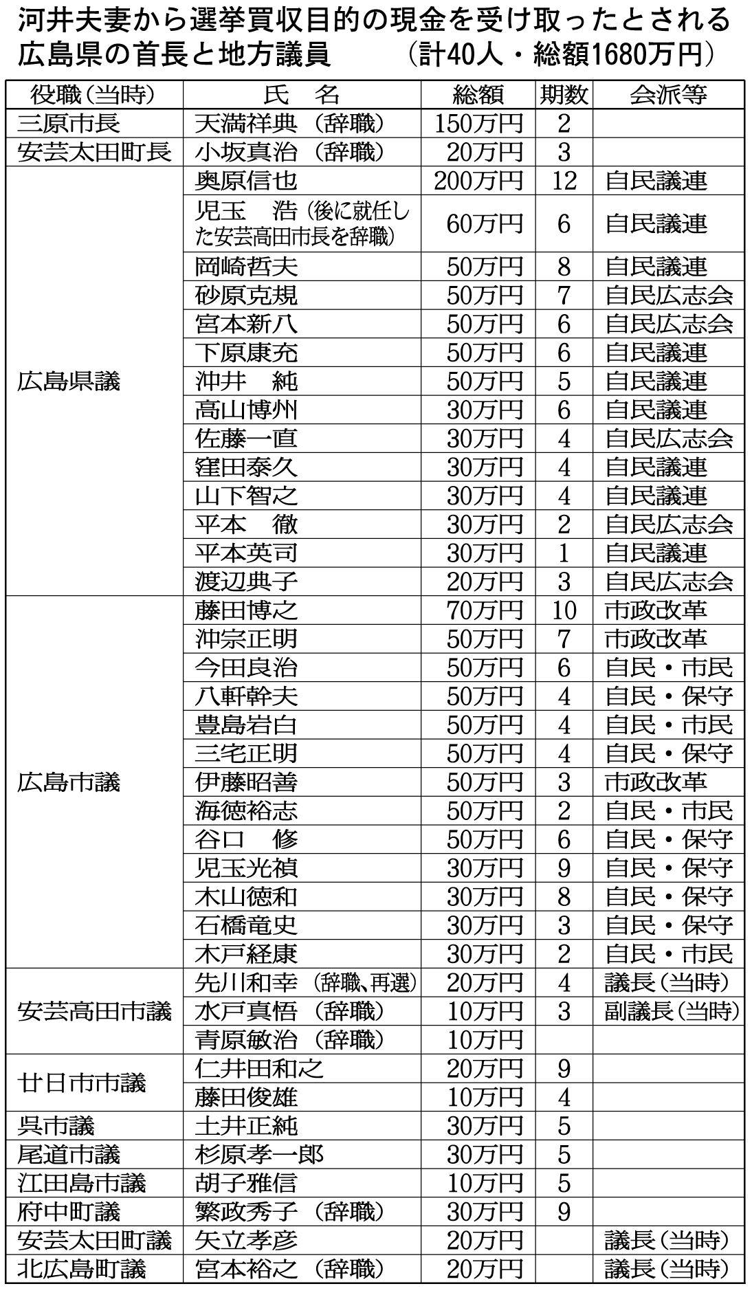 C 現金を受けとったのは、検察が家宅捜索で応酬した「配布リスト」に名前があった人物だけで100人以上にのぼる。地元政治家では、首長2人、県議14人、広島市議13人、安芸高田市議3人、廿日市市議2人、呉市議、尾道市議、江田島市議、府中町議、安芸太田町議、北広島町議が各1人の計40人【表参照】もいる他、後援会幹部、亀井静香の元秘書なども含まれていたという。