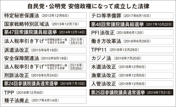 だからこそ私は今必要な施策として、とくに経済政策を大きく打ち出すべきだと思っている。どの選挙においても世論調査における最大関心事は圧倒的に経済問題だ。2012年に民主党・野田政権による自爆解散によって自民党が再び政権の座に復活したが、その後の8年間に何がおこなわれたか【表参照】。2019年までを見ても、特定秘密保護法に始まり、派遣法改正、安保法、TPP、種子法廃止……数々のろくでもない法案が強行採決され、そのたびに与党野党が焦点になったが、その間にあった4度の国政選挙で野党は1度も勝てていない。「自民党はやり過ぎだ」という世論調査が出ていても野党は全部負けてきた。