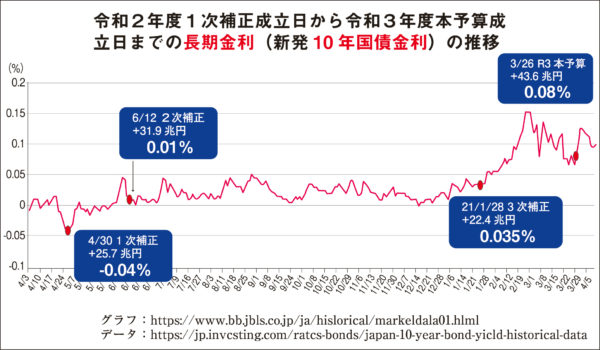 例えば一次補正で25・7兆円のお金を積み上げたときに、国債金利はマイナス0・04%。2021年度の本予算43・6兆円の金利を見たときに0・08%だ。一番上がったところでさえ超低金利だ。つまり日本が破綻するという考えを持っているマーケットは存在しない。2011年4月から21年の3月までを見ると、金利は落ちっぱなしだ【グラフ参照】。破綻する予兆は見えない。つまり日本政府はもっとお金を出せる。