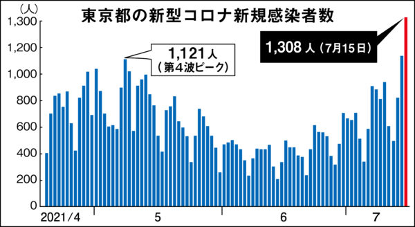 主な五輪競技の開催地である東京都内の感染現状は、早くから専門家が警告していた通り、6月下旬から再拡大の様相を見せ、7月15日には1月以降で最多の1308人を記録した。さらに同日、東京都は都内で新たに177人が、デルタ株の疑いがある「L452R」の変異ウイルスに感染していたことを発表。1日としては過去2番目に多く、検査実施件数に占める割合は約30%となった。