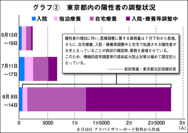 18日におこなわれた厚労省の専門家会議では、東京都北区保健所長の前田秀雄氏が、感染の急拡大によって「保健所の業務量は第三波の2倍をこえている」とのべ、「病床や宿泊療養施設がひっ迫しているため、新規に入院や宿泊療養へ処遇される陽性者は減少し」「自宅療養や入院・療養等調整中と、在宅で処遇される陽性者はさらに激増している」と現状を報告した【グラフ②参照】。