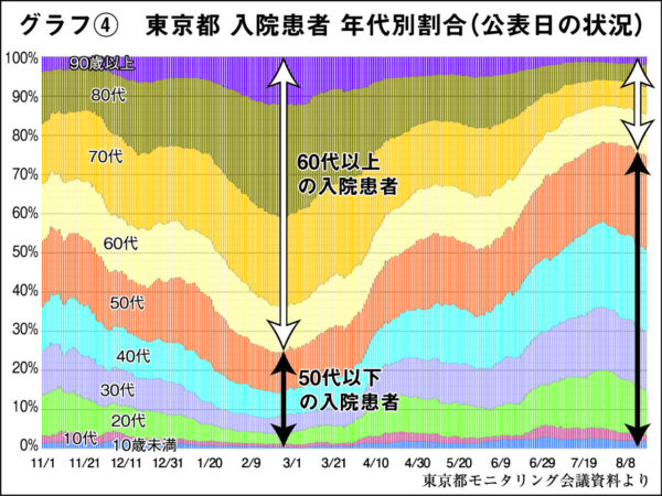 だが、東京都内の重症患者を年代別に見ると、確かにワクチンの効果もあって60代以上の高齢者の割合は減っているが、逆に50代以下の重症者が急増している【グラフ③参照】。50代が最多で、40代でも人工呼吸器を装着するほどの重症化に陥るケースが増しており、入院患者の年代別割合【グラフ④参照】でも同様の傾向にあることがわかる。デルタ株の出現により、「高齢者だけが危険であり、若年層は重症化しない」という前提は崩れていることは早くから専門家が指摘したことであり、国が急ぐべきは医療へのアクセスを制限することではなく、医療とともに、検査・隔離体制を拡大することにほかならない。