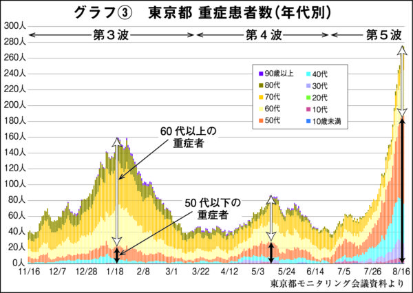 東京都内の入院患者も、21日時点で3964人と過去最多に達し、日々急激なペースで増加している。そのうち東京都の基準による重症者(人工呼吸器やエクモを装着した患者)は270人だが、国の基準による重症者(集中治療室で治療を受ける患者)は18日時点で1077人にのぼる。これも過去最多だった「第三波」を大きく上回る。