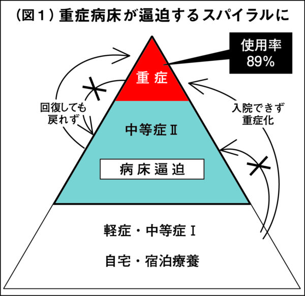 デルタ株に罹患した場合、軽症段階で早期に治療に乗り出さなければ重症化は防げないことが以前からわかっている。発症後7日以内に打たなければ効果がない抗体カクテル療法も、重症化を防ぐレムデシビル(抗ウイルス薬)も病院以外では使えない。軽症者を医療から切り離すことで初期段階で適切な治療が受けられないため、自宅で重症化していきなり重症病床に搬送される。また治療によって重症状態から脱した患者も中等症の病床に空きがないため戻ることができず、さらに重症病床が逼迫するという悪循環を作り出している【図①参照】。東京都の18日時点の重症病床の使用率は89%と、ほぼ満床状態が続いている。