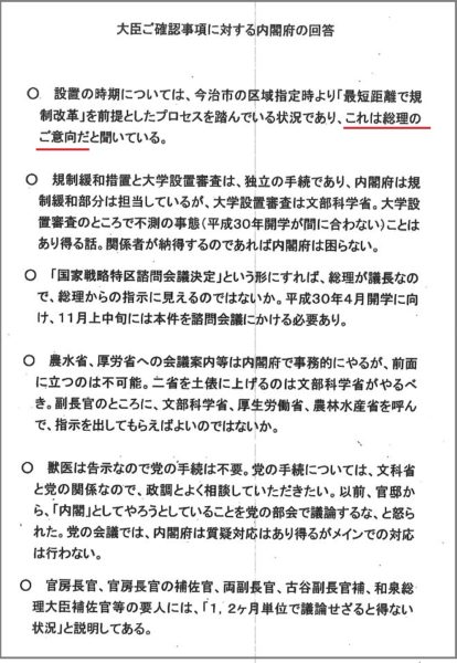 文科省が作成して保存していた「藤原内閣府審議官との打合せ概要(獣医学部新設)」(2016年9月26日付)などの内部文書では、国家戦略特区を担当する内閣府から、加計学園の獣医学部設置について「平成30年4月開学を大前提に逆算して、最短のスケジュールを作成し、共有していただきたい。これは官邸の最高レベルがいっていること」「『できない』という選択肢はなく、事務的にやることを早くやらないと責任をとることになる。早く政治のトップの判断に持って行く必要あり」「これは総理のご意向だ」などといわれていたことが記されていた。
