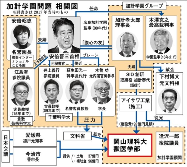 加計学園への優遇が疑われる理由のひとつには、学園と当時の政権担当者である安倍氏とのただならぬ親密さがあった【相関図参照】。
