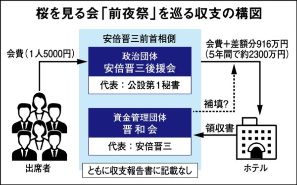 さらに不可解なことに、前夜祭の会場となったホテルが領収書を発行したのは、後援会宛てではなく、安倍氏が代表を務める資金管理団体「晋和会」宛てであった。後援会の収支報告書を見ても、そもそも数百万円もの補填ができるほど残高はない。つまり、5年間で約900万円もの差額分を補填していたのは「晋和会」である可能性が高い【図参照】。